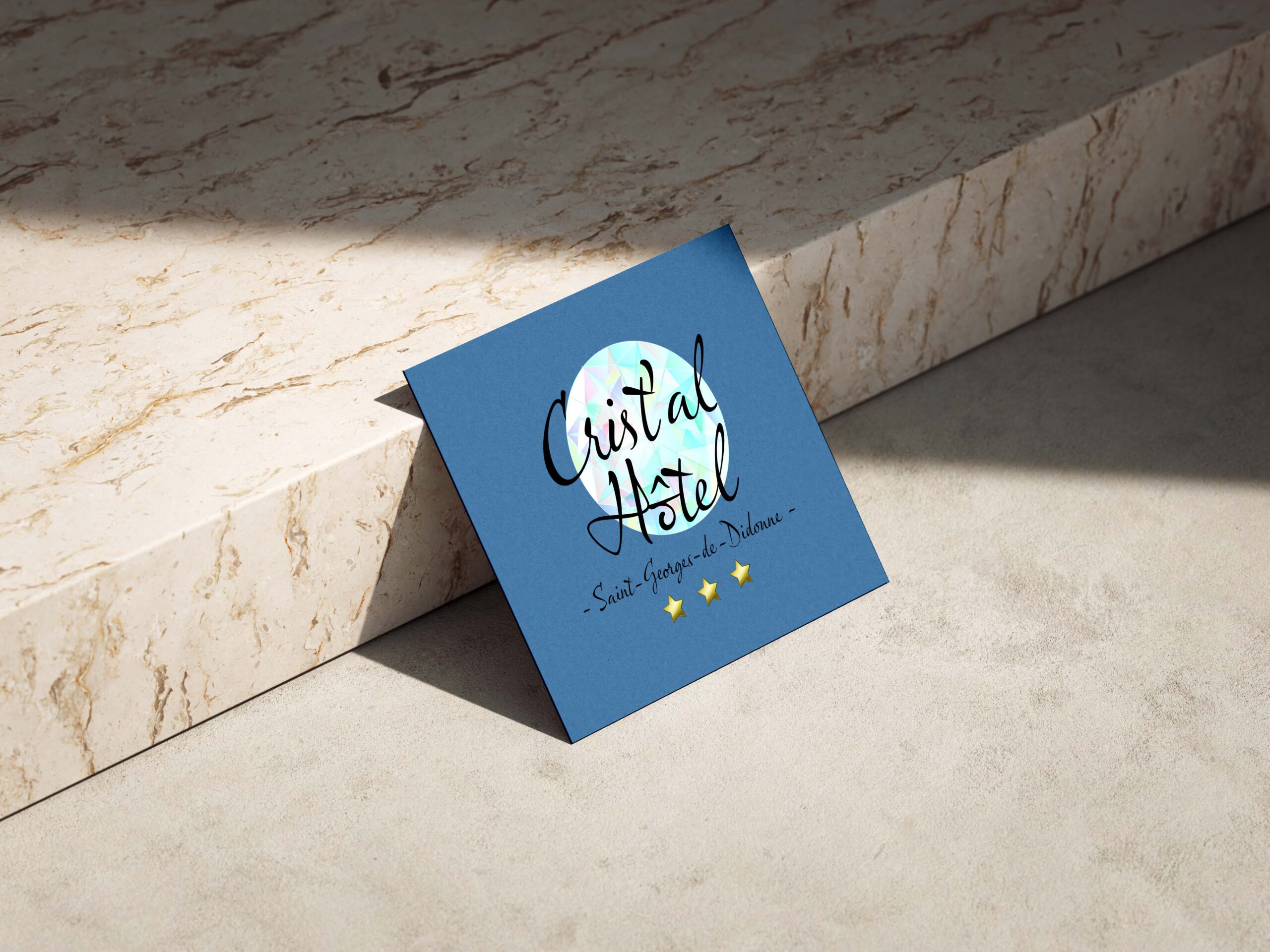 J’ai repris l’idée du cristal pour le logo tout en le rajeunissant en le passant en vue du dessus, plus graphique & moderne. J’ai choisi la typographie Olicana dans un style manuscrit à l’allure plus chic, réarrangé le nom de l’hôtel tout en gardant l’orthographe désirée pour le mot « crist’al », ai rajouté le nom de la commune et ai surtout inclus les 3 étoiles de l’établissement dans le logo.