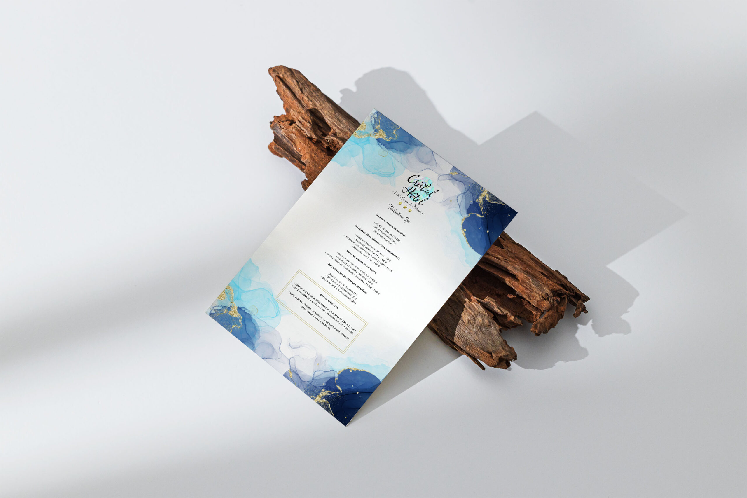 Pour l’ambiance du site, j’ai cherché à donner une impression de luxe tout en rappelant l’eau et le bord de mer: le fond aquarellé avec des touches de doré mis en tête et en pied de chaque pages convient parfaitement à cet usage et uniformise le visuel du site.