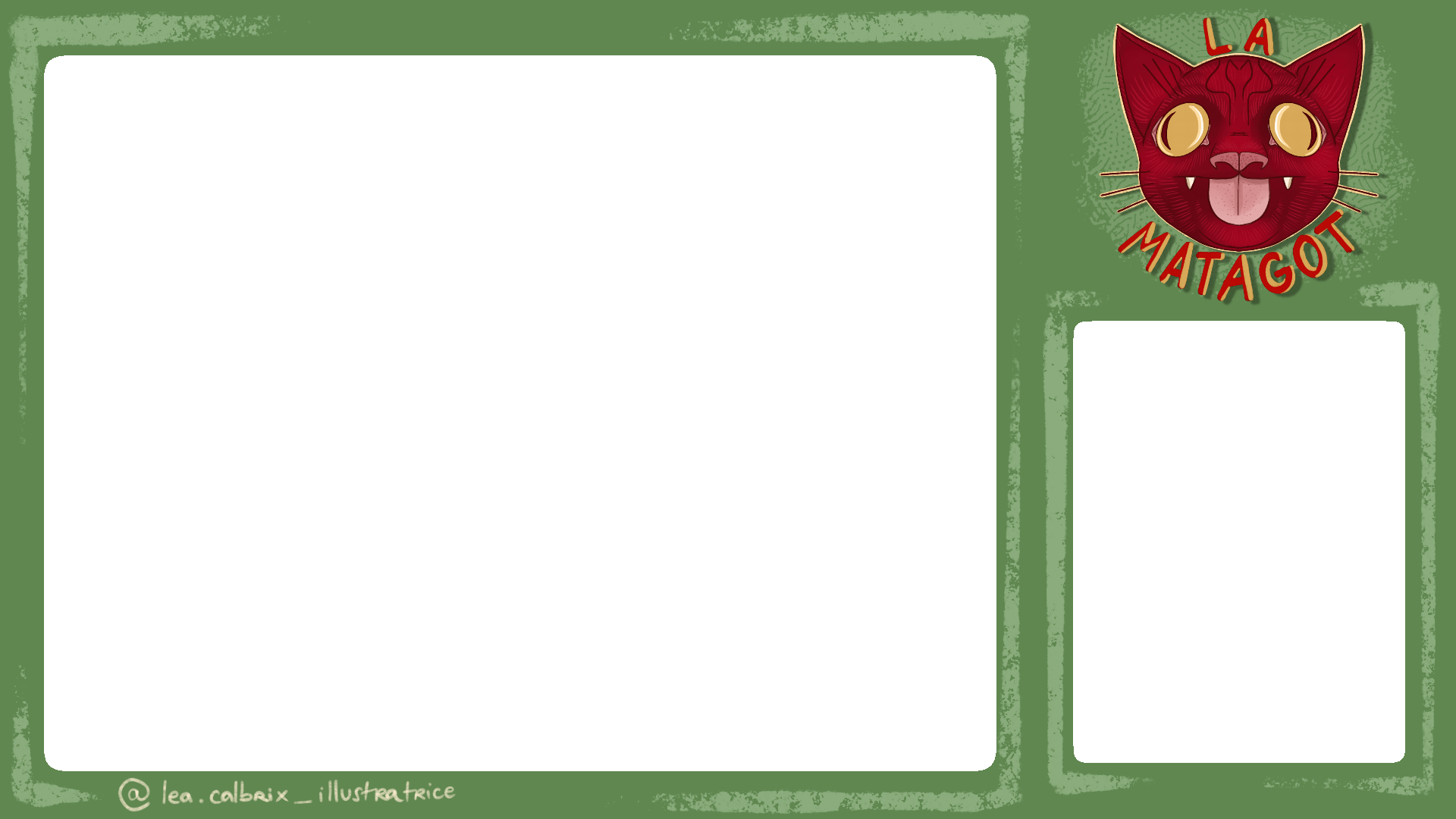 Le fond et le logo ont aussi été utilisé pour la création d’un overlay pour une éventuelle chaîne twitch où je diffuserais la création d’illustration en direct. J’ai aussi créé, dans le même but, un panneau d’attente représentant une empreinte de patte de chat en référence au personnage du logo.