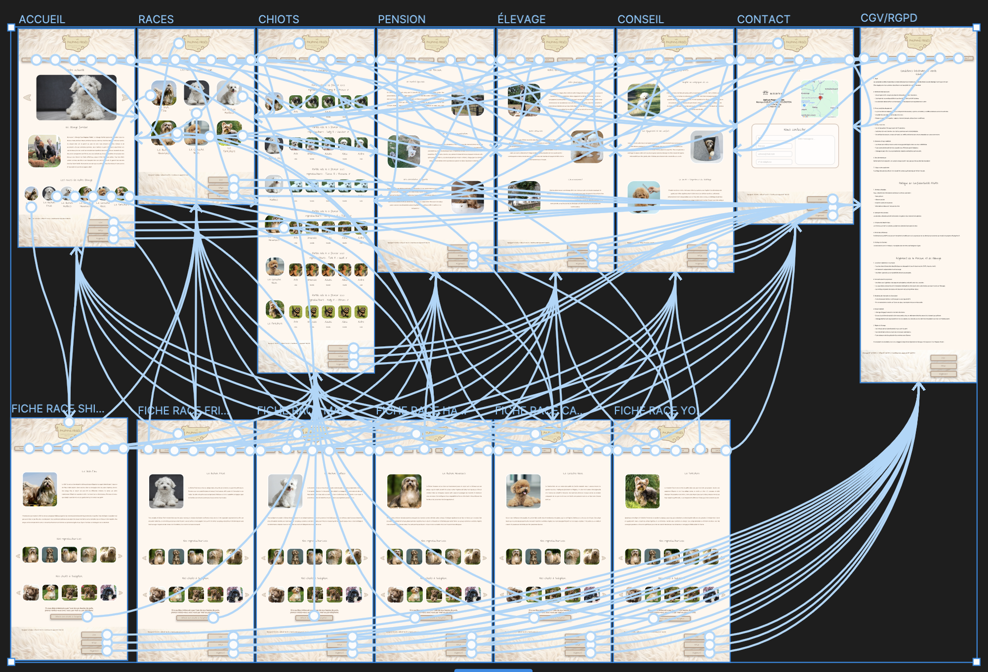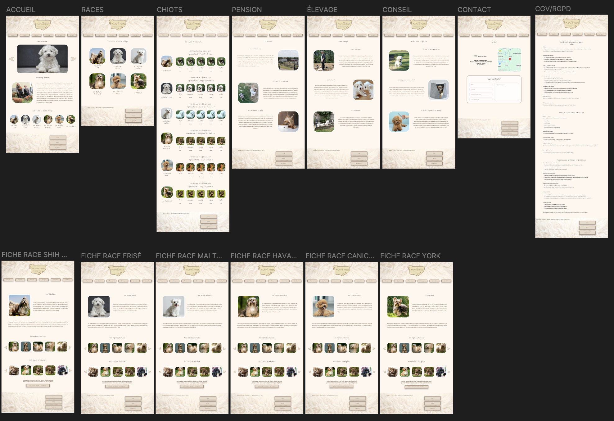 Pour le fond du header et du footer, j’ai utilisé une image que j’ai généré avec Adobe Firefly et qui fait écho au pelage frisés des chiens de l’élevage.