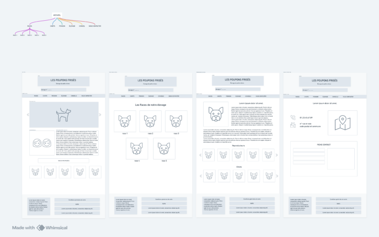 Deuxième étape, on vient affiner la première ébauche et l’on détaille le plan du site. Ça permet de valider les pages à créer et leurs thématiques, l’emplacement et la disposition des blocs, et de mettre du lorem ipsum pour donner une idée plus précise de ce que l’on souhaite.