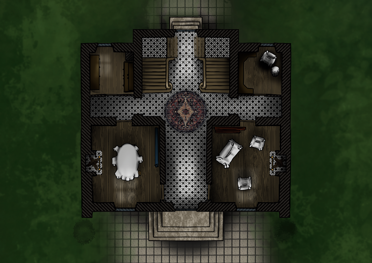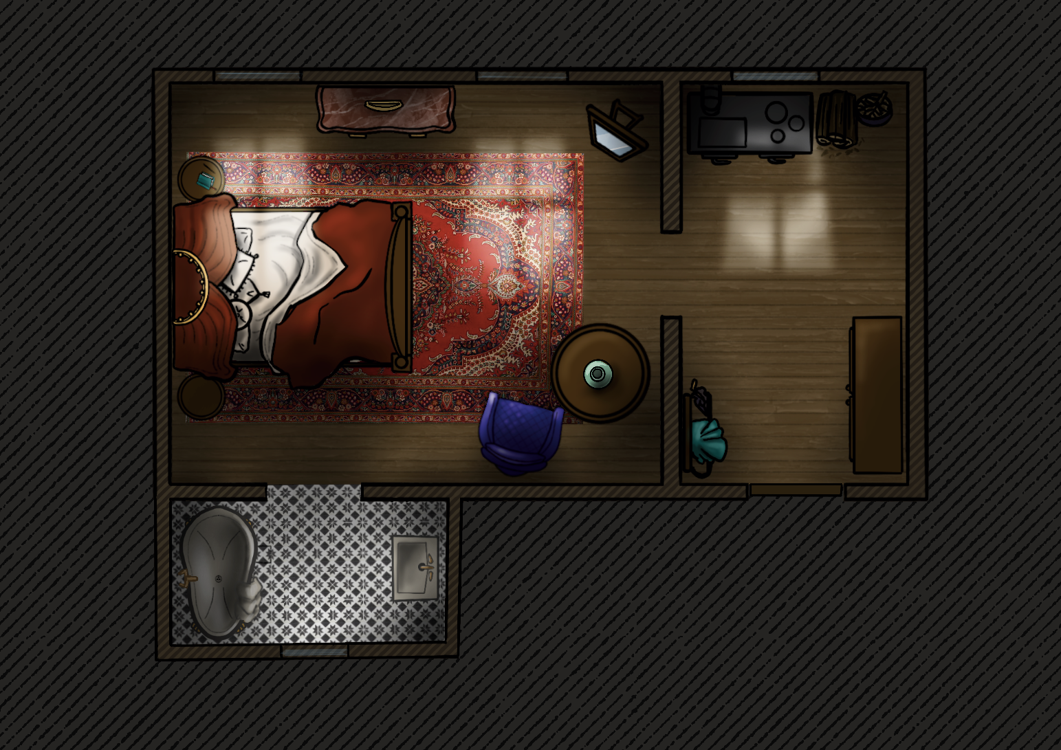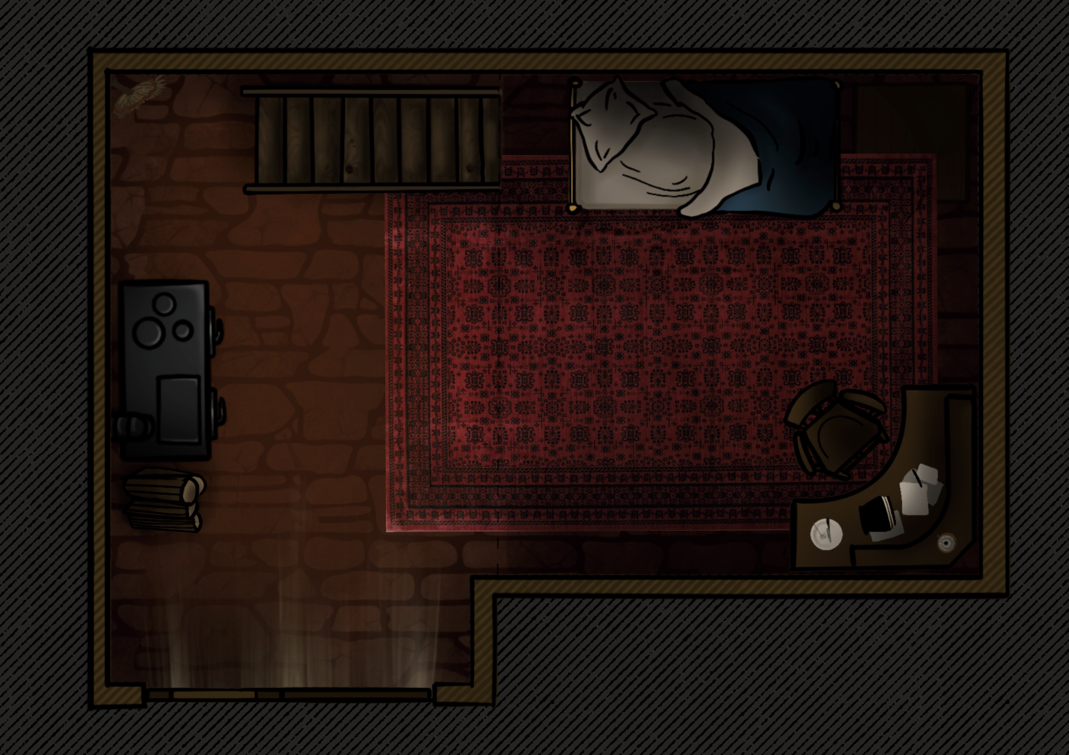 Je créée du matériel pour mes parties de jeu de rôle. J’y regroupe les maps (cartes vue du dessus), mais aussi d’autres éléments comme des items (lettres, affiches, pages de journal, …) que je dessine intégralement, imprime et mets en scène pour les joueurs de ma table de jeu.