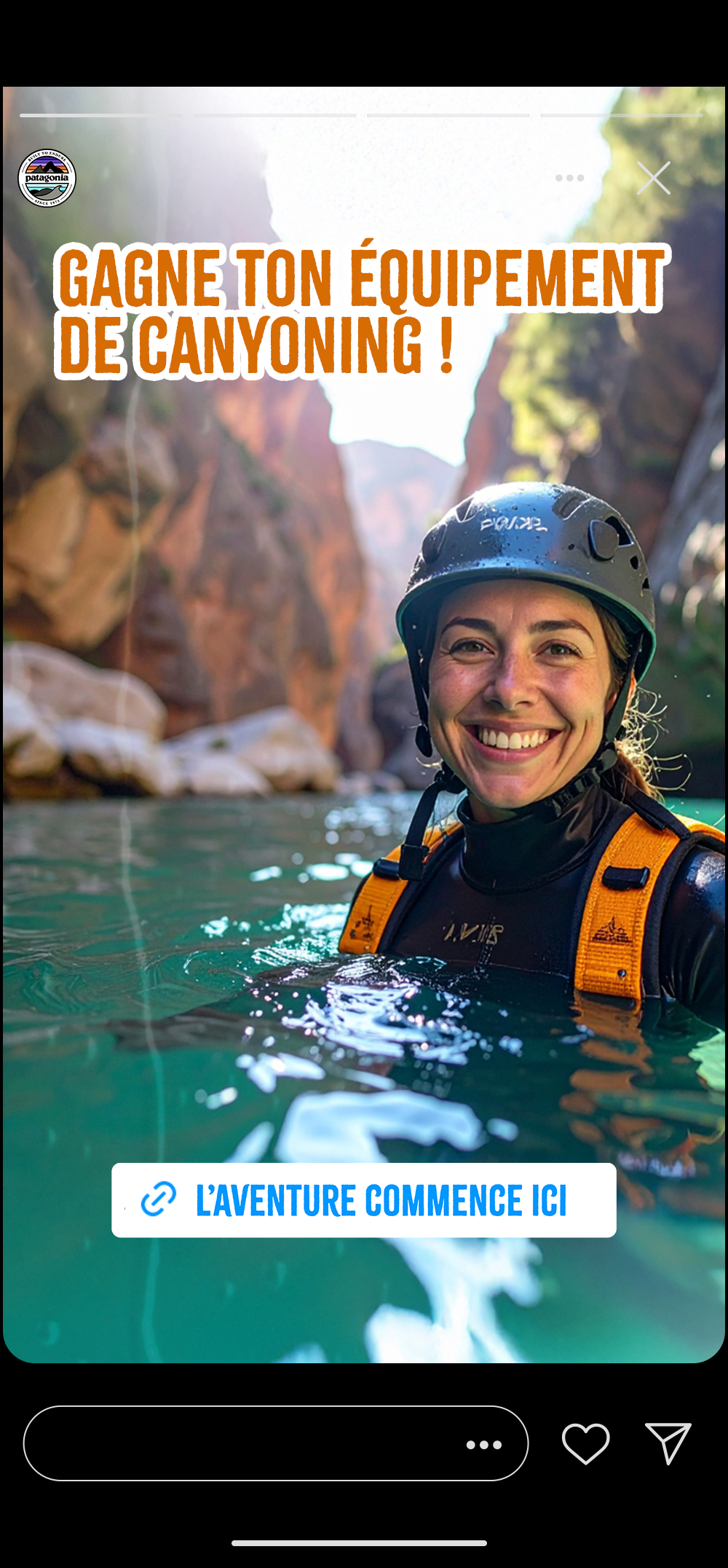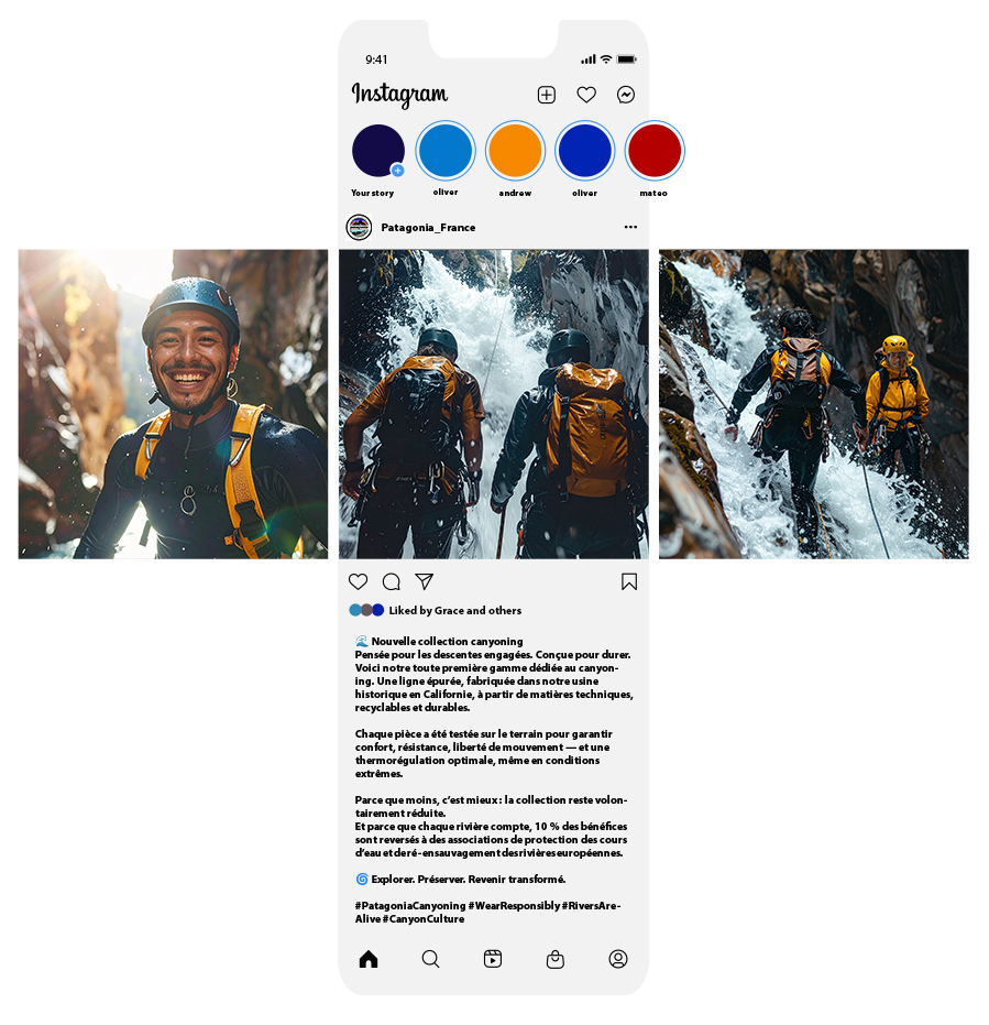 Mises en situations du profil de la marque Patagonia, montrant différents types de posts (concours, story et carrousel) mettant en avant leur nouvelle gamme – fictive – d’équipements de Canyoning.