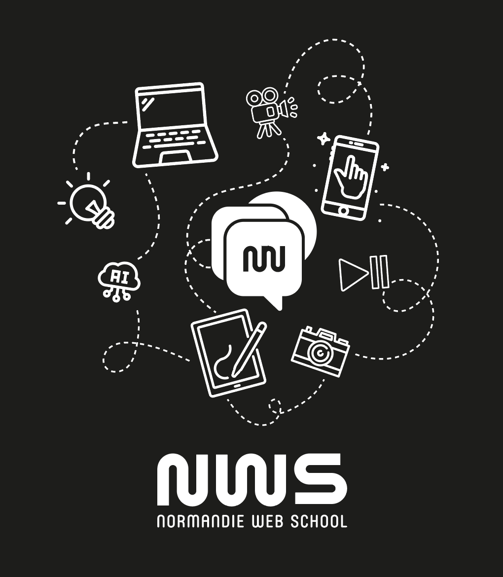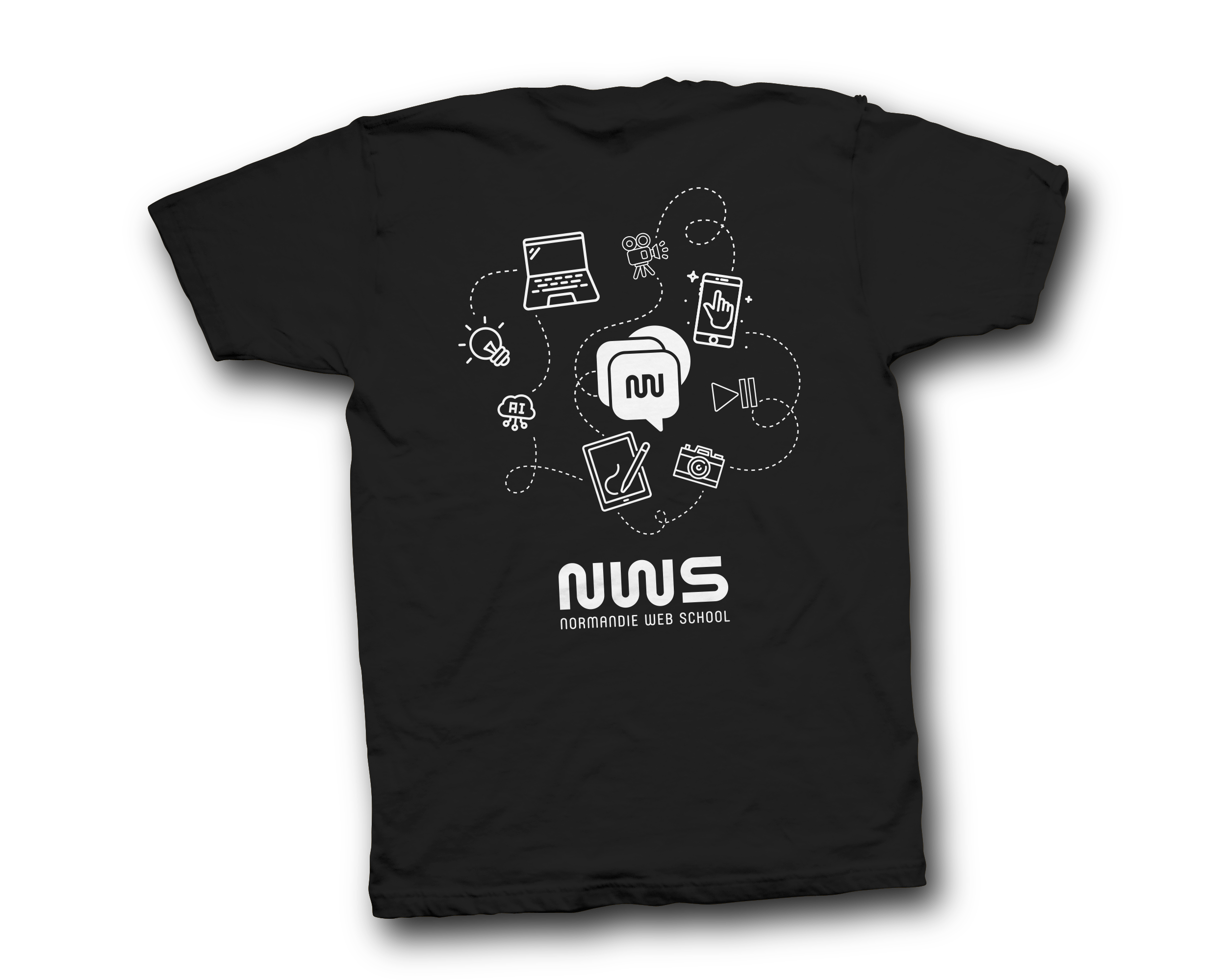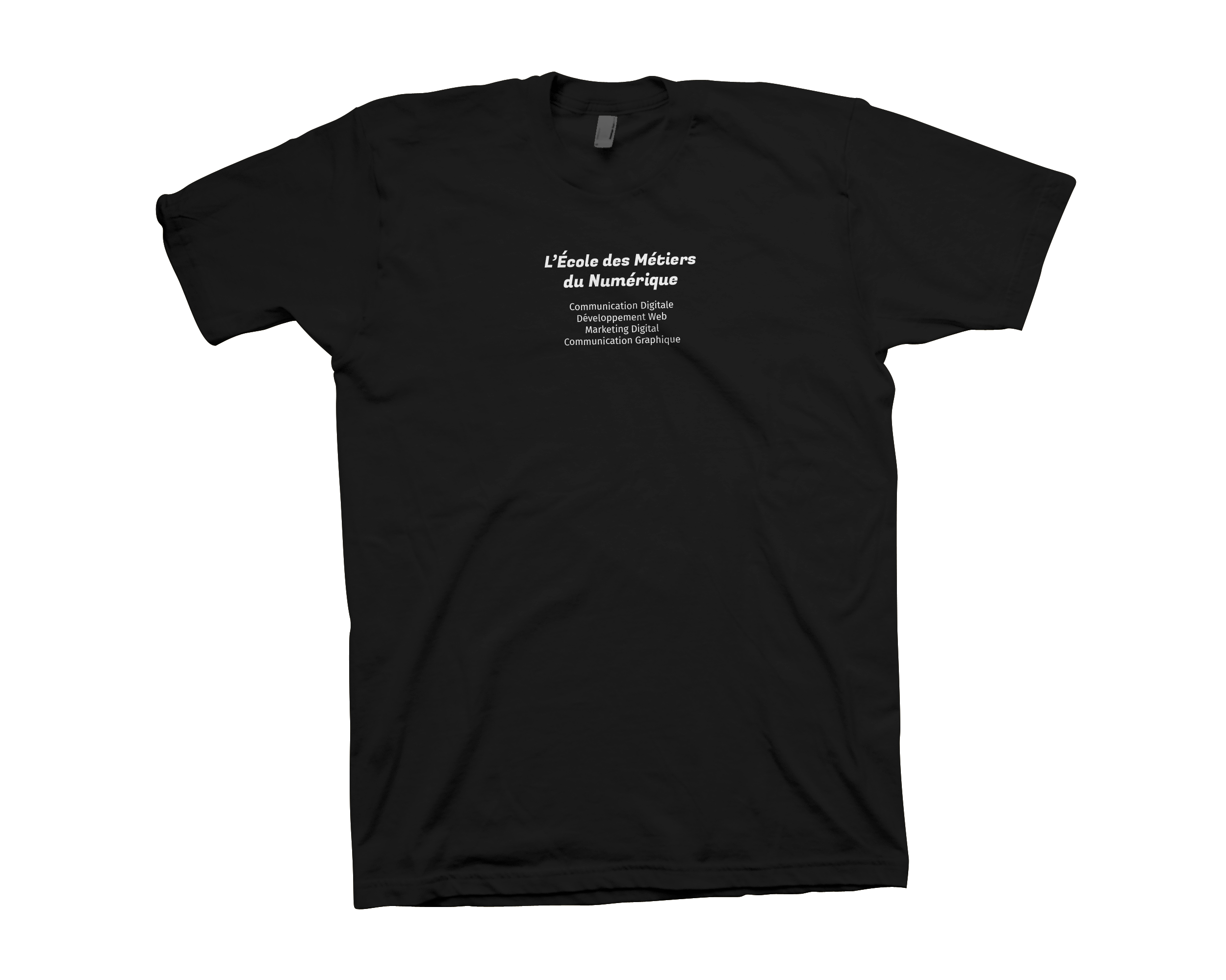 L’idée principale était simple : motifs et texte blanc sur un t-shirt noir. Cela devait inclure le logo de l’école, son « sous-titre », les spécialités proposées et un motif évoquant les métiers du numérique,
